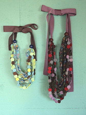 現在、SAVVY(京阪神エルマガジン社)にて担当させて頂いている、うめだ阪急セッセとのタイアップ企画「ちくちく手芸コトハジメ」。10月号掲載のニットネックレスを作るワークショップです。かぎ針でくさり目のコードを作り、フエルトと合わせて仕上げるネックレス。編み物を初めて見たい方にぴったりの初心者向けのデザインです。2色から好きな色と長さを選んで頂けます。